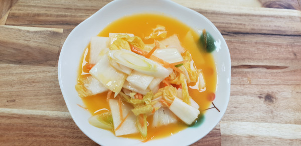 1. 무,당근,배추는 나박썰기해서 소금 20g에 절여 준다.